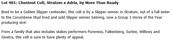 Corumbene Stud plays a significant part in all major yearling sales in Australia; sending quality drafts to both the Inglis and the Magic Millions Yearling Sales and in the past have consigned many leading yearlings.